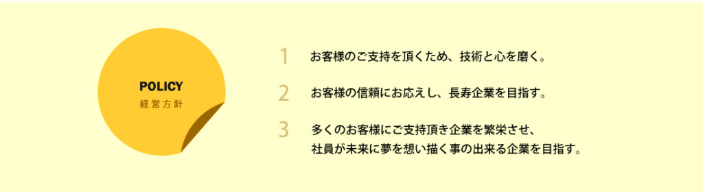「技術を磨き、心を磨き、ひたすらお客様の為に」をスローガンに掲げ、日々努力しております。襖張替からスケルトンリノベーションまで年間850件余りの工事を受注施工させて頂いております。人材に於いては、2級建築士、1級建築施工管理技士、マンションリフォームマネージャー、福祉住環境コーディネーター、1級技能士等の有資格者が在籍し皆様のご要望に適切にお応え出来る様研鑽に努めております。お客様の信頼にお応えし、ホームドクターの責任を果たす為、長寿企業を目指して参ります。