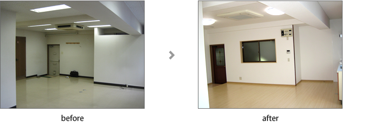 マンションの1室でタイルの解体の騒音を控える為、タイルの上にセメント系補修材で下地を修正し、塩ビタイル貼をご提案致しました。