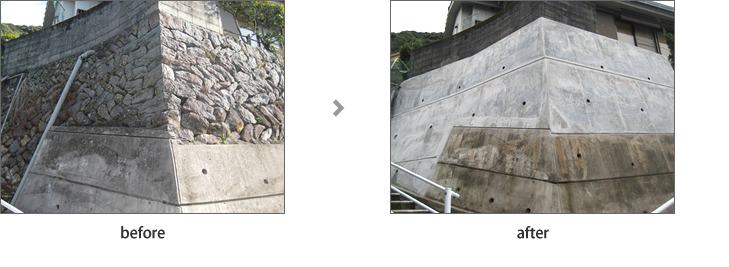 作業用足場を組み、鉄筋を配筋し、型枠、コンクリート打設頑丈な擁壁を完成しました。車が入らない傾斜地での作業は搬入搬出に苦労しました。
