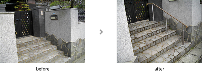 門柱が大きく、動線を考慮し,支柱型の手摺で夏でも暑くならない耐候性に優れた樹脂製を選定しました。。