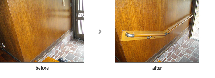 取付位置に壁下地が無かった為、ベースプレートを用いて最も利用しやすい位置にL型手摺を取付ました。また手摺が確認し易い濃い目の手摺を選定しました。