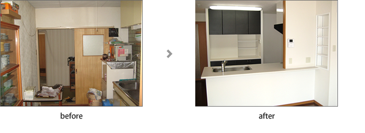 台所の間仕切り壁を撤去し、対面式のシステムキッチンを設置し背面にはカップボードと冷蔵庫スペースを設けました。