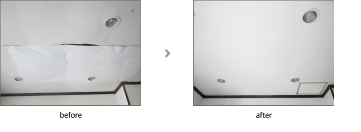 雨漏りで天井に大きな穴があき白い紙で塞いでいる。雨漏りを止めてクロスを貼替えてほしい。