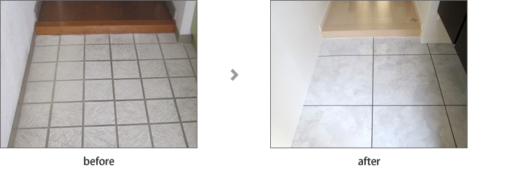 玄関の床をタイルから大理石調へ変更し、メンテナンスが容易なものをご希望。